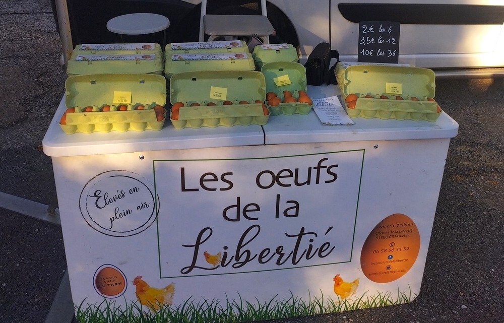 Située sur la route de Saint-Mémy, dans le chemin de la Libertié, Aymeric Delbreil a créé la ferme de la Libertié, une petite exploitation spécialisée dans l’élevage de poulets et de poules pondeuses. Il commercialise ses œufs chaque dimanche sur le marché place Jourdain ainsi que sur sa ferme par le biais d’un distributeur automatique d’œufs où vous pouvez, sept jours sur sept, vous procurer des œufs extra-frais.