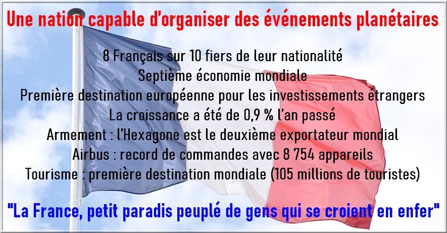 Et pourtant, les enquêtes d’opinion et autres sondages nous disent à longueur d’année que ces mêmes Français, supposés vantards et chauvins, sont aussi d’un indécrottable pessimisme.