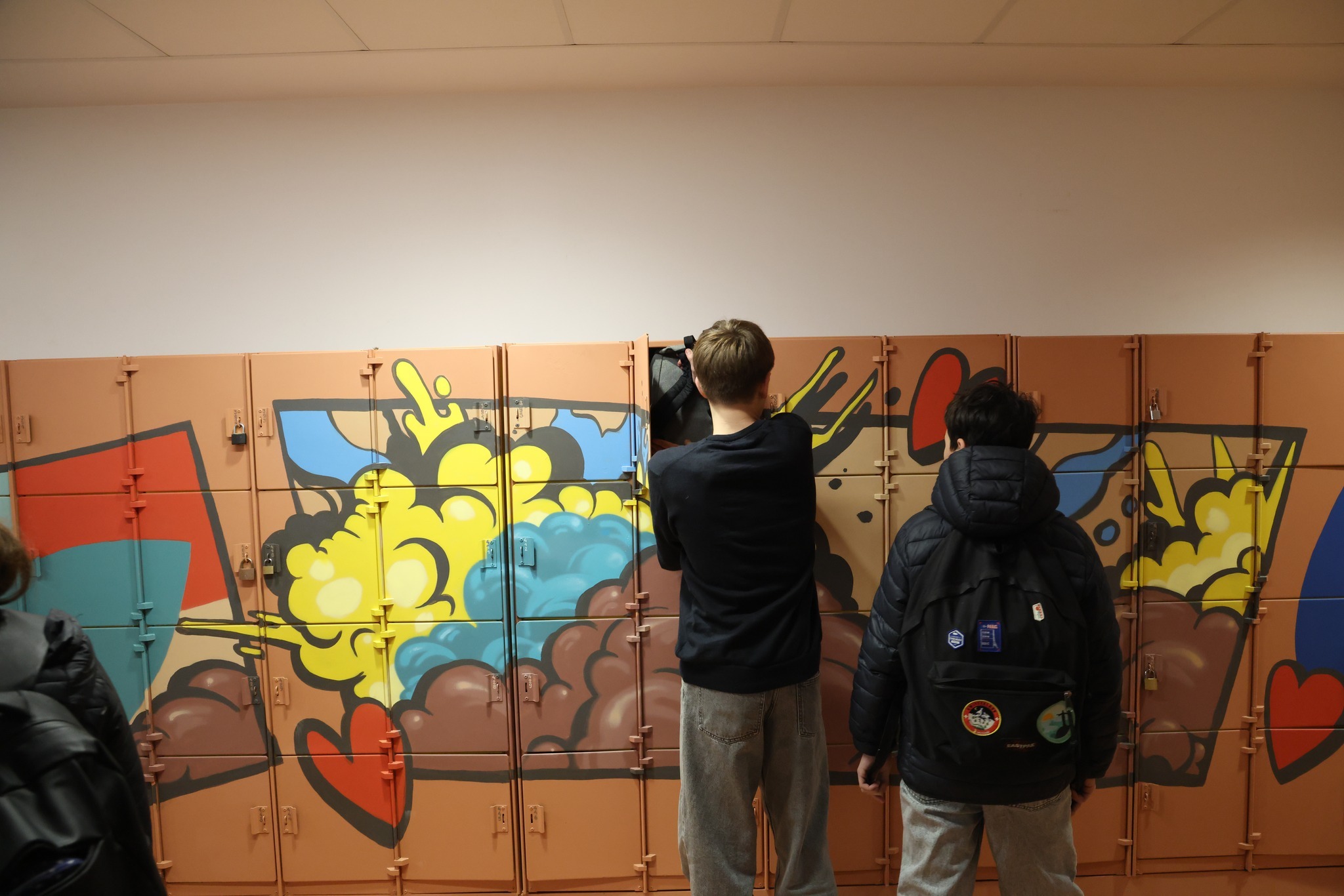 Dans le hall principal, les 256 casiers métalliques ont été rénovés et sont maintenant décorés par sept fresques